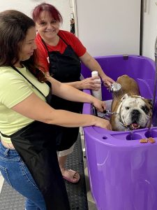 Náš nový psí lord s anglickým původem – Anglický buldog Banner si u nás  užíval koupel a masáž. Panička byla s ním a oba si to užili. Banner zkoušel virtuálně po anglicku teleportovat pamlsek, připravený na vaně.